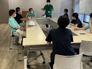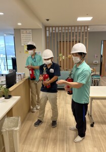 訓練では、職員が消火器を使った初期消火の練習や、消防署への通報手順の確認を行いました。その後、振り返りを行い、実際に火災が発生した時に落ち着いて対応できるよう行動を確認しました。