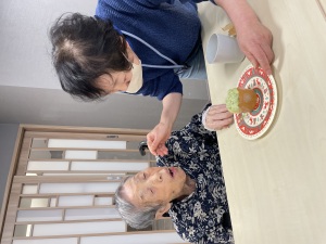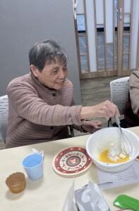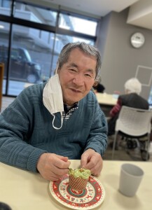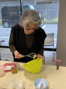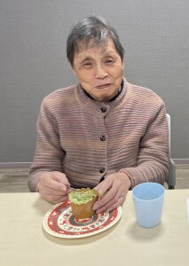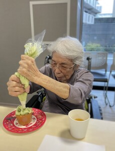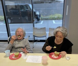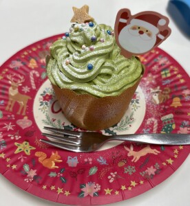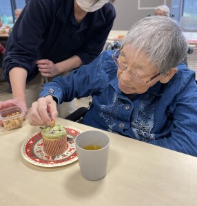 まずは材料を混ぜて生地を作り、カップに注ぎます。オーブンで焼いている間に、ホイップクリームを泡立てます。抹茶を混ぜてグリーンになったホイップを絞り乗せた途端、一気にクリスマスツリーに変身!スタッフ手作りの星形クッキーやアラザンなどをトッピングしたり、ホイップを絞ったり、デコレーションを行いました。面会にお越しになっていた娘様と一緒に作られたご利用者様もいました。このお顔をご覧頂ければ、どれだけ美味しかったか分かっていただけますね!