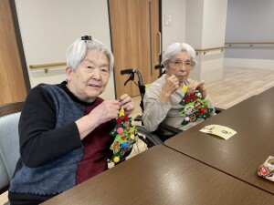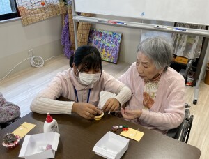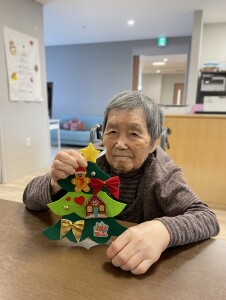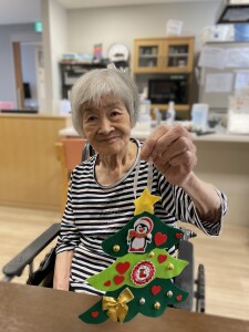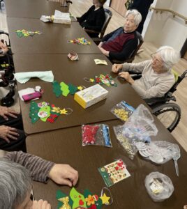 どこに付けようかな、お隣の人と相談しては笑顔が飛び交います。飾りが小さくてうまく扱えないご利用者様には、スタッフが一緒にお手伝いして、世界で一つだけのオリジナルツリーの完成です。
