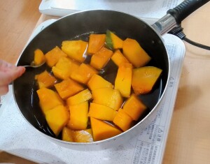 屋上菜園のかぼちゃで煮物と白玉団子を作りました。