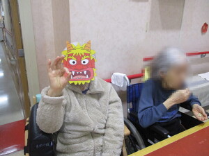 鬼のお面をかぶるスタッフに豆をまいたり、